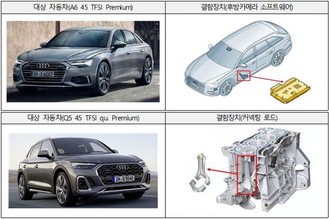 Q5 45 TFSI qu. Premium 등 4개 차종 1,018대(판매이전 포함)는 커넥팅 로드의 가공 불량에 따른 금속 이물질 발생으로 커넥팅 로드 베어링이 손상되고, 이로 인해 엔진이 파손될 가능성이 확인되어 자발적으로 시정조치(리콜)에 들어간다.