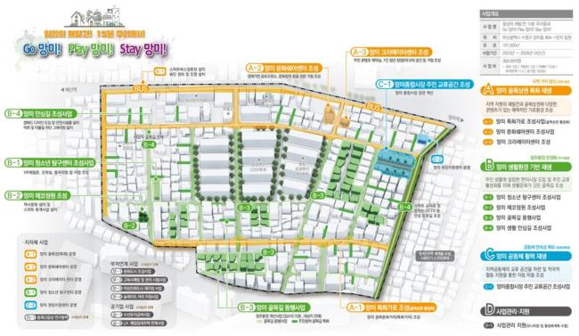 먼저, 부산시는 수영구 망미동(101,000㎡) `Go 망미! Play 망미! Stay 망미!` 사업에 총 369억 원(국비 120억 원)을 들여, F1963, 비콘그라운드, 망미단길, 수영 사적공원에서 동래 고읍성까지 지역 고유자원과 연계한 맞춤형 재생사업을 통해 도시브랜드화를 추진하고, 중심·골목상권 활성화 등을 위한 15분 동네 생활권 특화재생 사업을 추진한다.