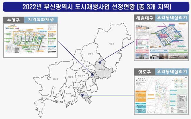 한편, 부산시는 지난 9월 국토부가 주최한 ▲‘2022년 도시재창조 한마당’ 도시 재생사업 우수사례 경진대회 지역 특화 분야에서 ‘대상’(부산 북구)을 차지하였으며 ▲‘2022년 대한민국 도시혁신 산업박람회’ 혁신행정 공모전에서 행정안전부장관상 ‘대상’(부산 서구)을 수상하는 등 전국 도시재생사업 선두자로서의 역할을 톡톡히 해나가고 있다.