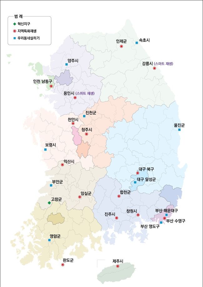 국토교통부는 제31차 도시재생특별위원회(위원장 한덕수 국무총리) 서면심의(12.7~14)를 거쳐 새 정부 첫 도시재생사업으로 경남 합천 등 총 26곳을 선정하였다고 밝혔다.