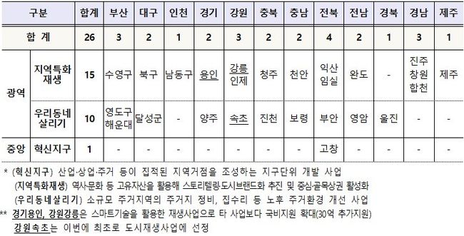 윤석열 정부 첫 도시재생사업 26곳 선정, ‘27년까지 1.5조원 투자 - 영상테마파크(합천), 뷰티산업(청주) 등 지역자원 활용 특화재생