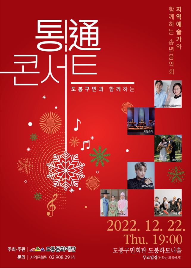 도봉구 도봉문화재단에서는 송년을 맞아 12월 22일 저녁 7시 도봉구민회관 하모니홀에서 ‘도봉구민과 함께하는 통!通(통통) 콘서트’를 연다고 밝혔다.