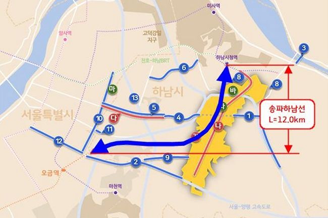 송파하남선은 서울 도시철도 3호선 오금역을 기점으로 하남시 감일지구와 교산지구를 지나 5호선 하남시청역까지 연결하는 총연장 12.0㎞, 총사업비 1조 5천401억 원 규모의 사업이다.