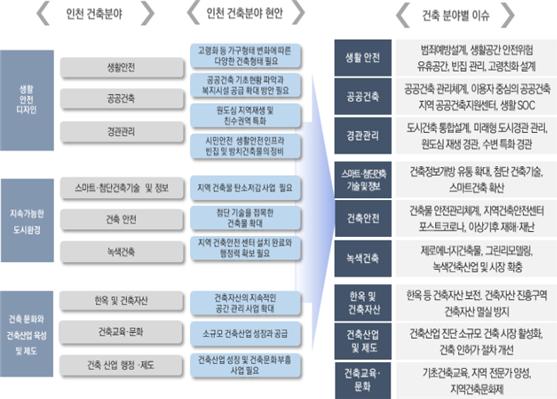 10대 전략으로는 △인구변화에 대응한‘공공건축 질 향상과 계층을 위한 건축·공간’△커뮤니티 맞춤형‘빈집·유휴공간 및 공간환경, 조성·관리’△지역균형을 찾는‘지역 특화 건축경관 창출과 건축경관 향상 방안’△기후위기 대응을 선도하는‘탄소제로 녹색공간 조성’△첨단기술과 건축정보의 스마트한 활용을 통한‘스마트 건축공간 마련’△소규모 건축물부터 재난 대응하기 위한‘건축물 안전성 확보’△건축자산의 보존·활용으로‘근대건축물과 공존하는 인천’△건축문화제 및 지역축제 활성화를 통한‘인천건축문화 확대’△전문가 및 시민건축교육 확대로‘남녀노소 건축평생교육’△지역 소규모 건축산업 육성 및 활성화로‘모두가 체감하는 건축, 새로운 변화’등이다.