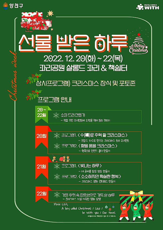 양천구는 성탄절을 맞아 온 가족이 함께 가까운 공원에서 올 한해를 마무리할 수 있도록 20일부터 23일까지 파리공원, 양천공원, 넘은들공원에서 ‘크리스마스 특별 공원문화프로그램’을 운영한다고 밝혔다.