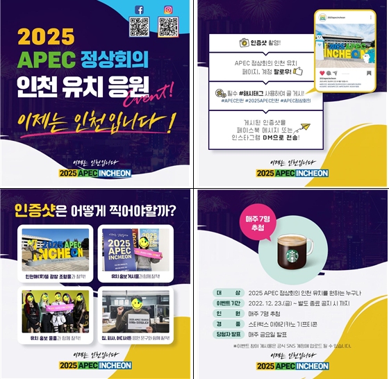 인천광역시은 2025년 대한민국에서 개최가 확정된 아시아‧태평양경제협력체(Asia-Pacific Economic Cooperation, APEC) 정상회의의 인천 유치를 위한 공식 소셜 미디어(SNS) 응원 이벤트를 실시한다고 밝혔다.