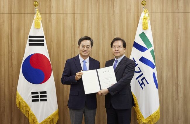 김동연 경기도지사가 22일 도청 집무실에서 김세용 전 서울주택도시공사 사장을 신임 경기주택도시공사(GH) 사장에 임명했다.