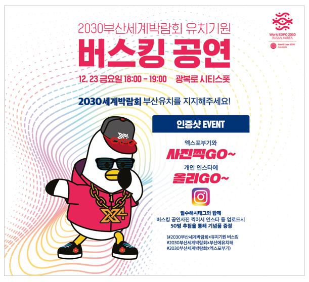 부산시, 광북로 겨울빛 트리축제 연계 2030부산세계박람회 유치기원 버스킹 공연 개최 - 12.23. 18:00~19:00 중구 광복로 시티스폿에서 진행 - 부산지역 인디밴드 `콩브로`와 `버닝소다`가 버스킹 공연 펼치면서 2030부산세계박람회 유치 공감대 조성 예정