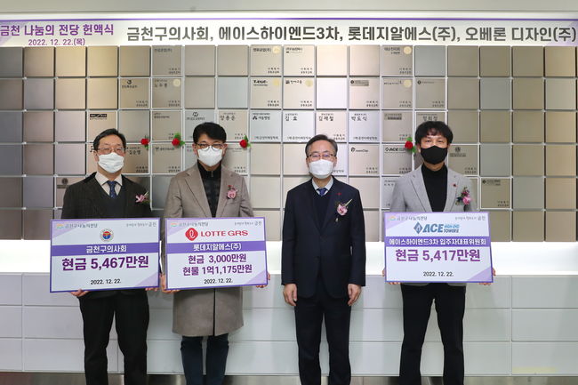 금천구는 그동안 따뜻한 기부를 실천해 온 금천구의사회, 에이스하이엔드3차 입주자대표위원회, 롯데지알에스, 오베론 디자인 대표이사를 금천 나눔의 전당에 새롭게 올렸다.