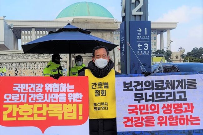 대한응급구조사협회 강용수 부회장이 계속되는 강추위에도 불구하고 간호법안 저지를 위한 보건복지의료연대 릴레이 1인 시위를 이어갔다.