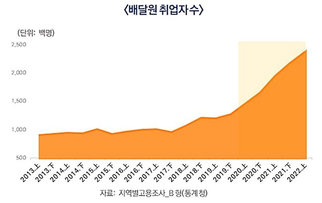 실태조사 결과에 따르면 배달업에 종사하는 배달원 수는 `19년 상반기 119,626명에서 `22년 상반기 237,188명으로 약 2배 증가한 것으로 나타났다.