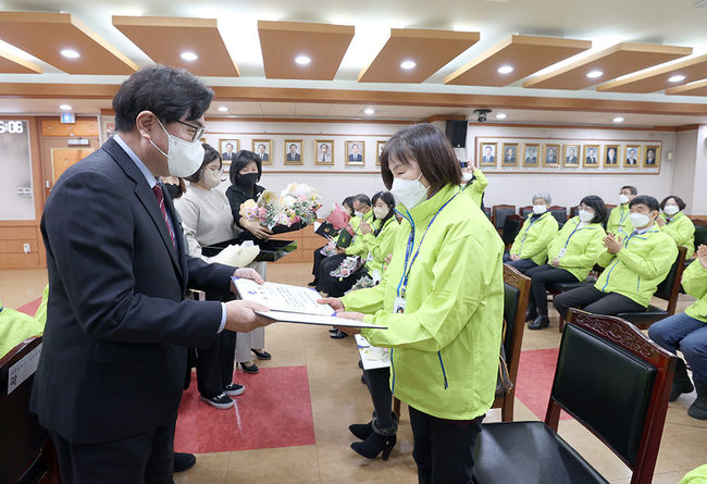 박일하 동작구청장은 27일 구청 기획상황실에서 동작구 문화관광해설사에게 위촉장을 수여하고 있다.