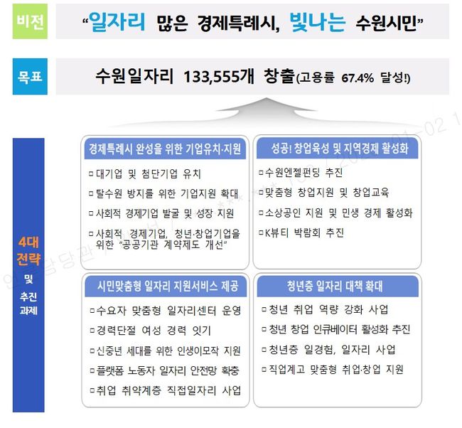 추진 과제는 대기업·첨단기업 유치, 탈수원 방지를 위한 기업지원 확대, 수원엔젤펀딩 추진, 수요자 맞춤형 일자리센터 운영, 경력 단절 여성 경력 잇기, 청년 취업역량 강화 사업 등이다.