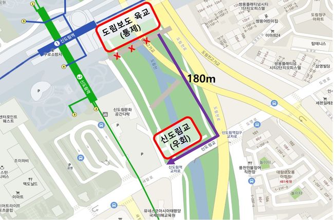 이에 구는 도림보도육교를 이용하는 주민들의 안전을 위해 ‘신도림교’로 우회할 것을 안내했다. 육교 이용자가 ‘신도림교’로 도보 우회 시 2분(180m) 정도가 소요된다. 도림천 하부 자전거 도로‧산책로는 해당 구간 전면 통제되어 ‘신도림교’ 등 우회 도로를 이용하면 된다.
