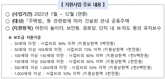 올해 공동주택 지원 규모는 385백 만원(시설보수비 315백만 원, 보안등 전기요금 70백만 원)으로, 시설보수비는 준공 후 10년이 경과한 단지를 대상으로 세대수에 따라 총비용의 50~90% 내에서 최대 5백만 원~3천만 원까지 지원하며, 보안등 전기요금은 준공 경과년수 관계없이 90%까지 지원한다.