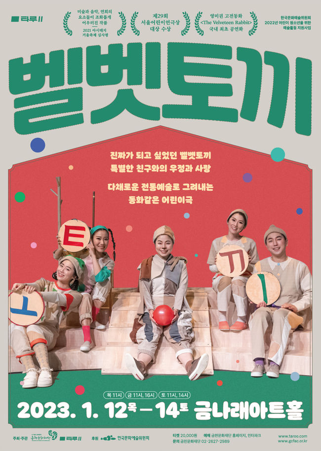 금천문화재단 오진이 대표이사는 “토끼해를 맞아 금나래아트홀 새해 첫 기획공연으로 서울어린이연극제 대상 수상작인 ‘벨벳토끼’ 공연을 준비했다”라며, “작품이 품고 있는 따뜻한 정서에 누구나 갖고 있는 소중한 기억이 더해져 관객분들이 특별한 감동을 느낄 수 있을 것”이라고 전했다.