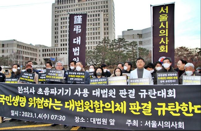 서울특별시의사회는 1월 4일 오전 7시 30분, 대법원 맞은편에서 서울시의사회 35대 집행부, 23대 대의원회 운영위원회, 감사단, 각구의사회장, 회원 등 150여 명이 모여 ‘한의사 초음파기기 사용 대법원판결 규탄대회’를 개최했다.