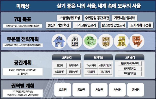 서울시는 향후 20년 서울의 미래상으로 ‘살기 좋은 나의 서울, 세계 속에 모두의 서울’ 을 제시하고, 이를 실현하기 위한 7대 목표, 부문별 전략계획, 공간계획, 권역별 계획 등을 여기에 담았다.