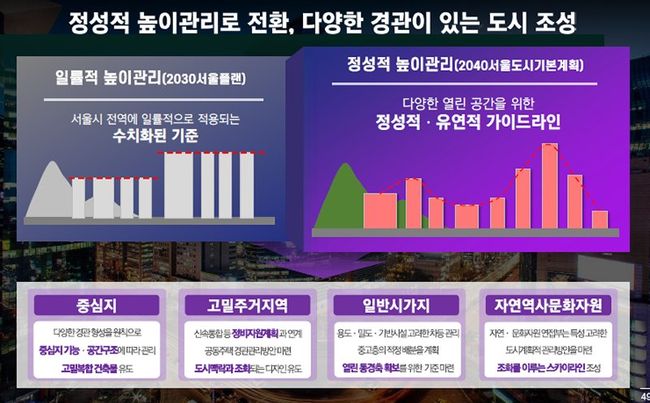 일률적·절대적 수치 기준으로 적용했던 35층 높이 제한을 과감히 삭제하고 지역 여건을 고려한 정성적 스카이라인 관리로 전환한 점도 돋보인다. 앞으로 정비사업을 추진할 아파트단지 등에서 더 다양한 설계안이 나오는 것은 물론, 창의적인 도시경관이 창출될 것으로 기대한다.