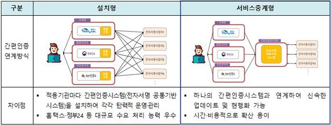 한편, 행정안전부는 간편인증 서비스를 적용하는 기관의 부담을 줄이기 위해 기존 ‘설치형’ 연계 방식 이외에도 ‘서비스 중계형’ 연계 방식을 추가했다.
