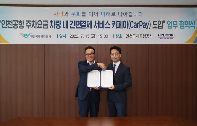 인천국제공항공사는 지난 15일 공사 회의실에서 현대자동차그룹과 인천공항 주차요금 차량 내 간편결제 서비스 ‘카페이(CarPay) (이하‘카페이’)’도입을 위한 업무협약을 체결했다고 18일 밝혔다.