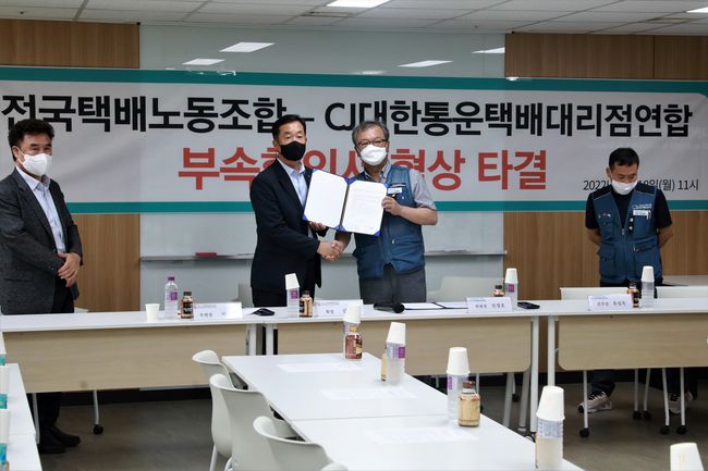 전국택배노동조합과 CJ대한통운대리점연합이 18일 서울 중구 대리점연합 사무실에서 기자회견을 열고 표준계약서 부속합의서에 관해 합의를 봤다고 발표했다.양측이 타결한 내용을 보면 우선 개인별로 택배 물품을 차량에 싣는 인수 시간을 기존에 제한이 없던 것에서 하루 3시간 이내 제한으로 변경해 장시간 업무를 방지하기로 했다.