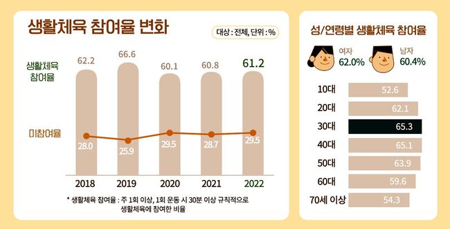2022년 생활체육 참여율(주 1회, 30분 이상 규칙적 체육활동)은 61.2%로 전년도 60.8% 대비 0.4%포인트(p) 증가했다. 코로나19 이전 수준에는 못 미치지만 전년에 이어 회복세를 보이는 것으로 나타났다.