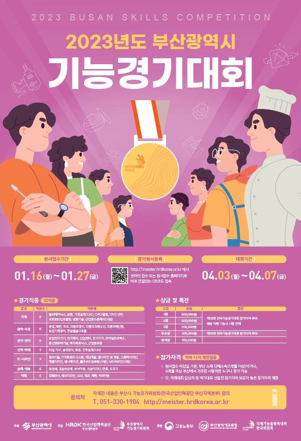 부산광역시 기능경기위원회는 `2023년 부산광역시 기능경기대회` (4.3.~4.7.)에 참가할 기능인을 모집한다고 밝혔다.