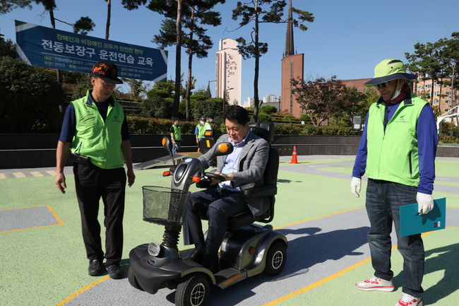 `전동보장구 전용 운전연습장`에서 박준희 관악구청장이 안전교육 프로그램을 체험하고 있다