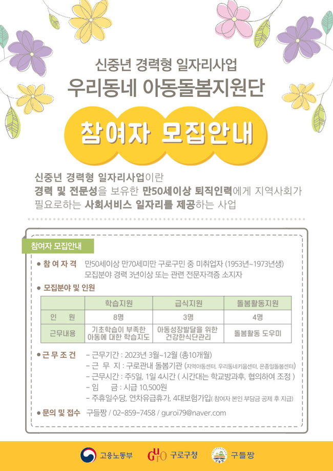 구로구는 “관내 돌봄시설에는 전문인력을, 참여자들에게는 재취업의 기회를 제공할 수 있는 일자리 사업을 운영한다”고 밝혔다.