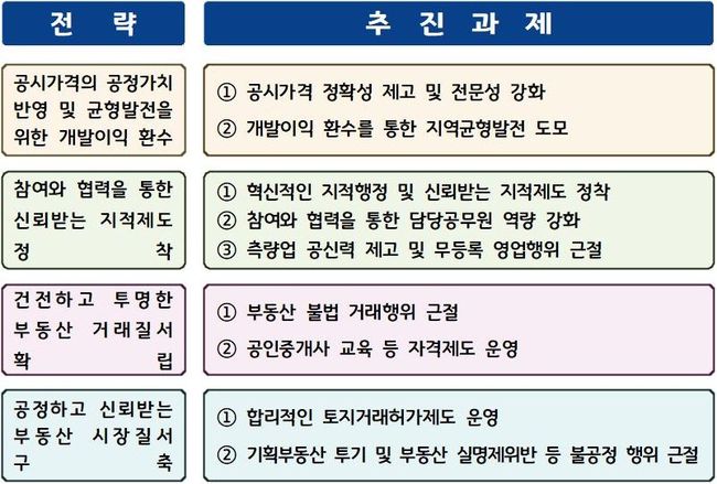 이번 추진계획은 ▲공시가격의 공정가치 반영 및 균형발전을 위한 개발이익 환수 ▲참여와 협력을 통한 신뢰받는 지적제도 정착 ▲건전하고 투명한 부동산 거래질서 확립 ▲공정하고 신뢰받는 부동산 시장질서 구축 ▲공간정보 융·복합을 통한 스마트한 정책 지원 ▲촘촘하게 연결된 주소정보 구현 및 주소체계 고도화 ▲지적재조사사업 활성화 및 안정적 사업추진 등 7대 전략을 바탕으로 한 75개 세부 이행과제로 구성됐다.