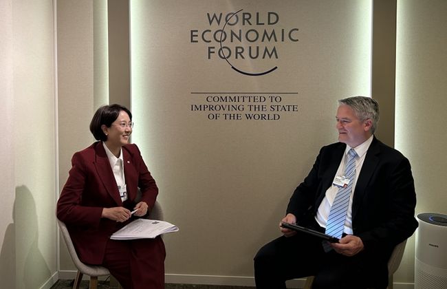 이영 중소벤처기업부 장관이 18일(현지시간) 스위스 다보스에서 마티아스 코먼(Mathias Cormann) OECD 사무총장을 만나 OECD 회원국과의 정책공유 확대방안을 논의하고 있다.