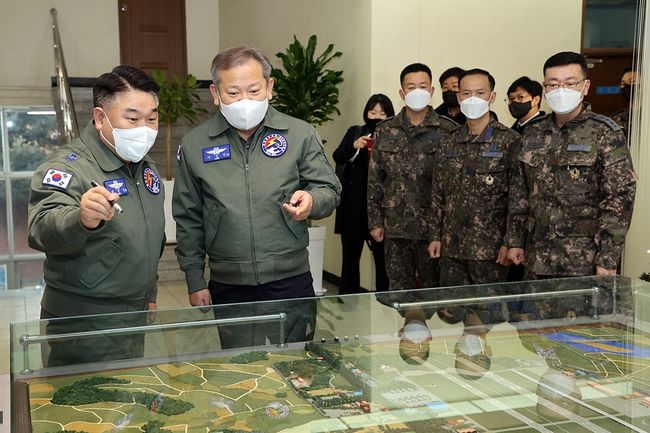 이상민 행정안전부 장관이 19일 오전 충북 청주시 소재 제17전투비행단을 방문하여 주요 훈련체계 등을 청취하고 군장병들을 위문 격려하고 있다.