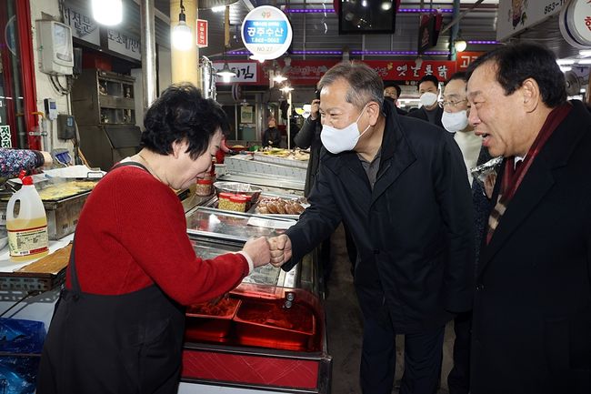 이상민 행정안전부 장관이 19일 오후 설 명절을 앞두고 세종특별자치시 전통시장을 방문하여 물가 동향 등을 점검하고 상인들을 격려하고 있다.