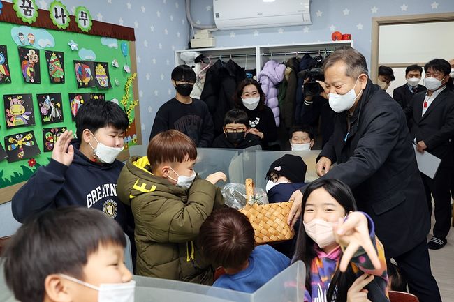 이상민 행정안전부 장관이 19일 오후 설 명절을 앞두고 충북 청주시 소재 파랑새지역아동센터를 방문하여 어린이들을 격려하고 있다.