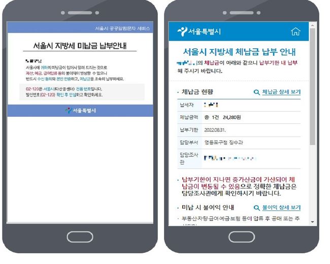 체납정보 모바일 문자서비스 화면이다. 체납금액, 담당 직원 이름과 전화번호를 확인 후 바로 납부할 수 있다.