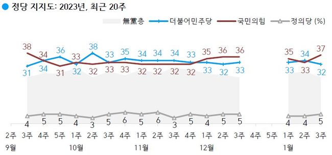 2023년 1월 셋째 주(17~19일) 현재 지지하는 정당은 국민의힘 37%, 더불어민주당 32%, 지지하는 정당 없는 무당(無黨)층 25%, 정의당 5%다.