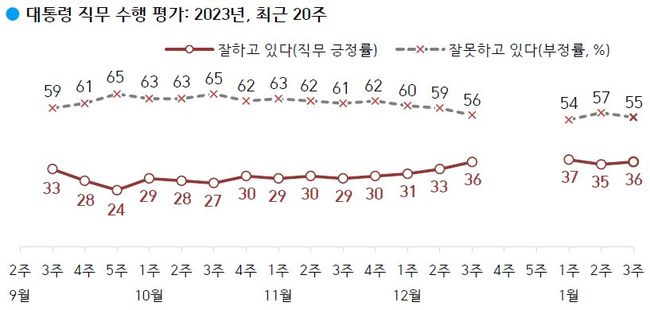 한국갤럽이 2023년 1월 셋째 주 전국 만 18세 이상 1,000명에게 윤석열 대통령이 현재 대통령으로서의 직무를 잘 수행하고 있다고 보는지 잘못 수행하고 있다고 보는지 물은 결과, 36%가 긍정 평가했고 55%는 부정 평가했으며 그 외는 의견을 유보했다.