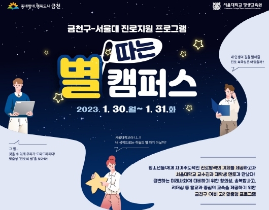 금천구는 1월 30일부터 31일까지 서울대학교 캠퍼스 본원에서 고등학생 50명을 대상으로 캠프형 멘토링 프로그램 ‘별 따는 캠퍼스’를 실시한다고 밝혔다.