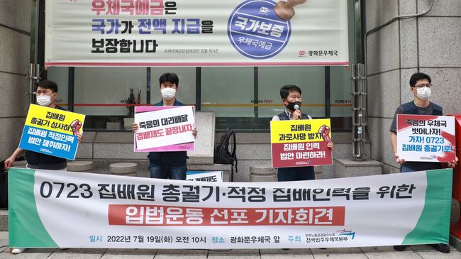 민주노총 공공운수노조 전국민주우체국본부는 19일 서울 종로구 광화문 우체국 앞에서 `0723 집배원 총궐기 및 적정 집배인력 확충 입법운동 선포` 기자회견을 가졌다. 기자회견 참가자들은 “집배원 적정인력 법안 쟁취하자” "죽음의 대리배달 끝내자" "죽음의 우체국 벗어나자" 등의 구호를 외치면서 향후 집배 인력을 늘리기 위한 입법운동에 나설 것을 천명했다.