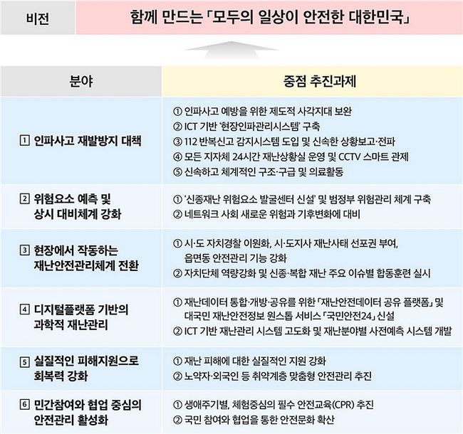 종합대책은 ‘함께 만드는 모두의 일상이 안전한 대한민국’을 비전으로, ‘새로운 위험에 상시 대비하고 현장에서 작동하는 국가 재난안전관리체계 확립’을 목표로 5대 추진전략과 65개의 과제를 담았다.
