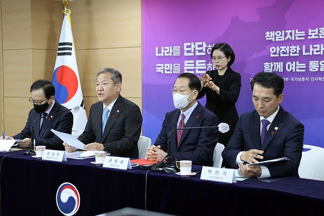 이상민 행정안전부 장관이 27일 오후 서울 종로구 세종대로 정부서울청사에서 2023년 업무계획보고에 대한 브리핑을 하고 있다. 사진 왼쪽부터 김승호 인사혁신처장, 이상민 행정안전부 장관, 권영세 통일부 장관, 박민식 국가보훈처장
