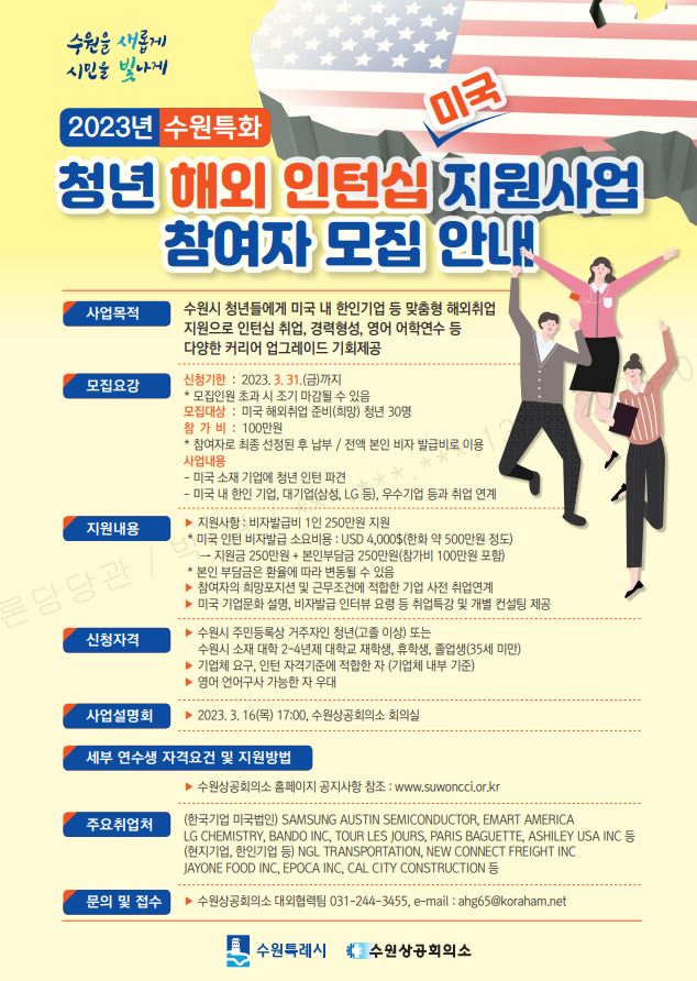 수원시는 3월31일까지 ‘2023년 수원특화 청년 해외 인턴십(미국) 지원사업’에 참여할 고졸 이상의 만 34세 이하 청년 30명을 모집한다고 밝혔다.