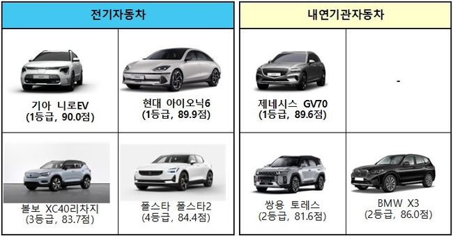 기아 니로EV(종합1등급, 90.0점), 현대 아이오닉6(종합1등급, 89.9점), 제네시스 GV70(종합1등급, 89.6)은 충돌안전성, 외부통행자안전성, 사고예방안전성 전반에서 좋은 점수를 얻으면서 1등급을 받았다.