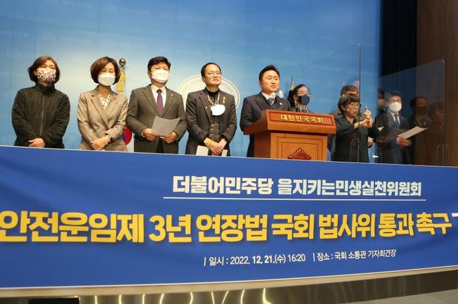 더불어민주당 을지키는 민생실천위원회 소속 의원들이 지난해 12월21일 국회 소통관에서 안전운임제 3년 연장법 국회 법사위 통과 촉구 기자회견을 열고 있다.
