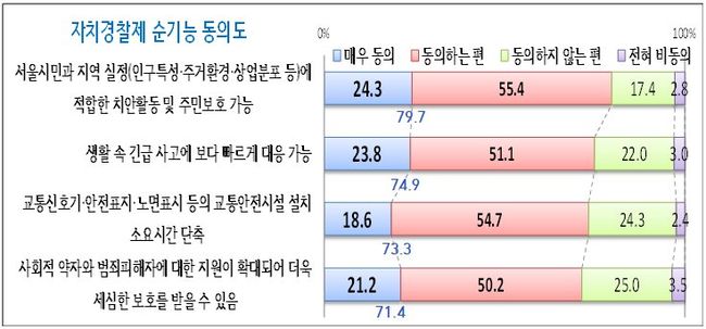 인식조사는 작년 12월9일부터 19일(11일간)까지 만 18세 이상의 서울시민 2,000명을 대상으로 △자치경찰제 인지도와 △생활안전 △사회적 약자 보호 △교통안전 분야의 안전 체감도와 강화해야 할 사업 등을 조사했다.