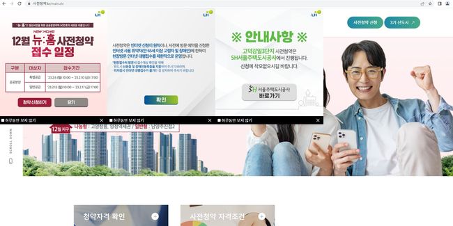 국토교통부는 오는 2월6일부터 고양창릉, 양정역세권, 남양주진접2 등에서 약 2천 3백호 규모의 공공분양주택 뉴:홈 사전청약 접수가 시작된다고 1일 밝혔다. 사전청약 홈페이지 화면