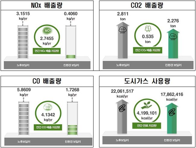 환경부와 한국환경산업기술원의 연구 결과에 따르면 노후 보일러를 친환경 보일러로 교체할 경우, 질소산화물은 연간 약 87%, 일산화탄소는 70.5%가 저감되며, 이산화탄소는 19%가 저감된다.