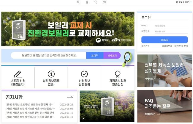 가정용 보일러 인증 및 보조금 신청 시스템 홈페이지 캡처 화면