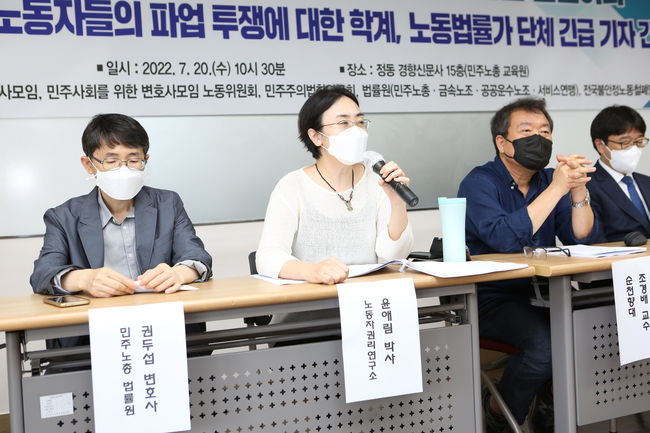 민주사회를 위한 변호사모임(민변) 등 노동법률단체 소속 변호사들과 관련 학계 교수들은 20일 서울 중구 민주노총 교육원에서 `대우조선 원청 사용자 책임 부정 관련 긴급 기자간담회`를 열었다.